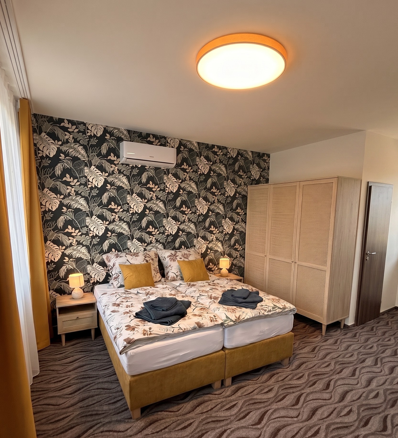 Každý pokoj nabízí plnohodnotné vybavení, kvalitní postel, chytré technologie a vše potřebné pro pohodlný odpočinek. Stylově zařízené interiéry navazují na celkový charakter hotelu a kombinují jednoduchost s elegancí.